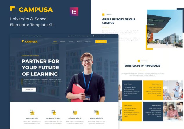 Campusa adalah template kit Elementor yang modern dan unik untuk universitas & sekolah. Dirancang khusus untuk situs web universitas, sekolah, perguruan tinggi, atau layanan terkait lainnya. Template ini dilengkapi dengan 10 halaman berbeda untuk situs web Anda. Kit ini dioptimalkan untuk tema gratis Hello Elementor tetapi dapat digunakan dengan sebagian besar tema yang mendukung Elementor.