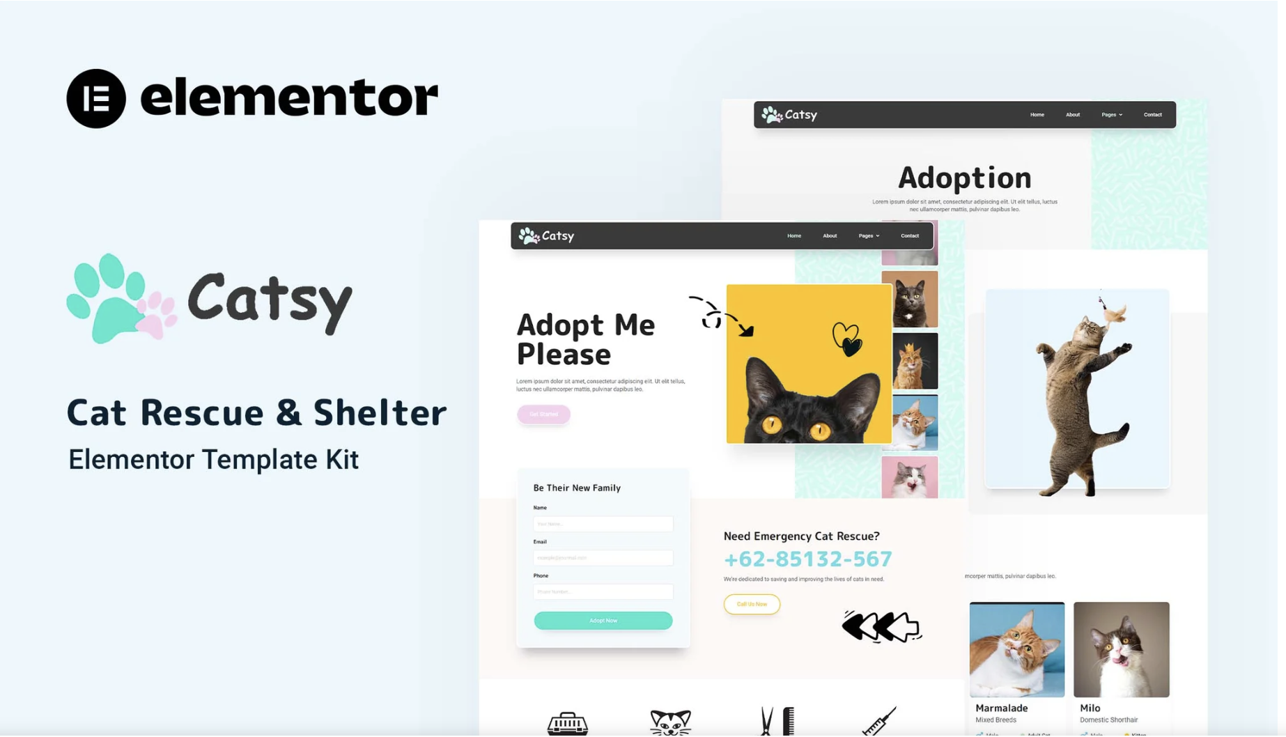 Catsy adalah Template Kit Elementor yang dirancang untuk membuat situs web dengan cepat dan mudah untuk penampungan hewan peliharaan atau bisnis kucing menggunakan plugin Elementor Page Builder untuk WordPress. Template Kit ini bukan tema WordPress, melainkan kit yang berisi konten halaman untuk Elementor yang dapat diimpor dan digunakan untuk membangun situs tanpa perlu menulis kode. Kit ini dioptimalkan untuk digunakan dengan tema Hello Elementor gratis tetapi juga dapat digunakan dengan sebagian besar tema yang mendukung Elementor.