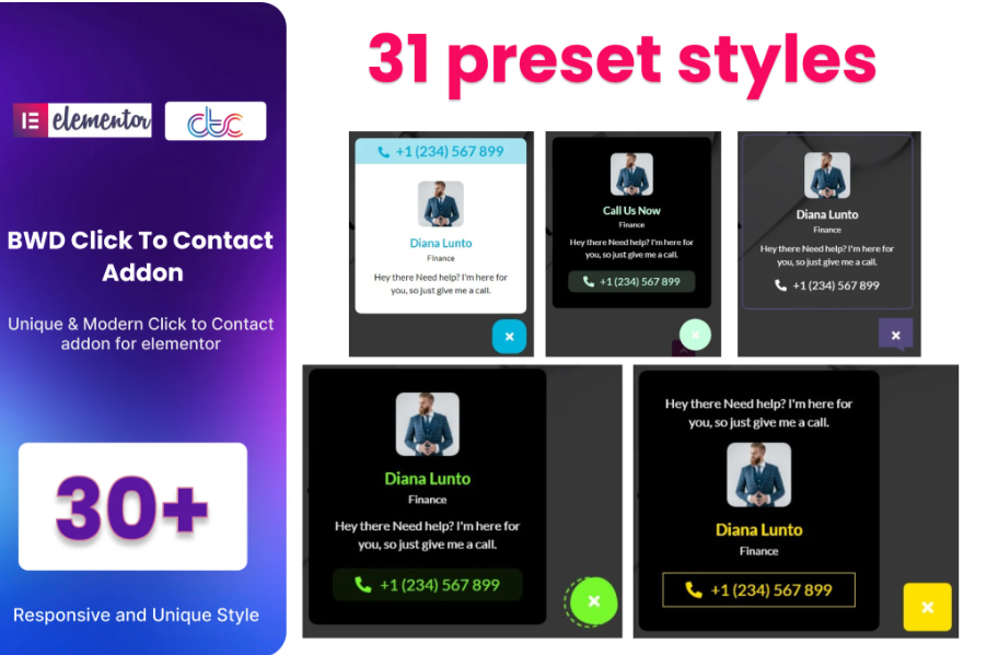 Click To Contact adalah plugin WordPress berbasis Elementor yang ringan untuk menambahkan tombol klik-untuk-hubungi yang menarik ke situs web Anda tanpa perlu pengetahuan kode. Tersedia lebih dari 30 desain preset unik yang tampak menakjubkan. Untuk informasi lebih lanjut, lebih dari 100 desain akan segera tersedia.