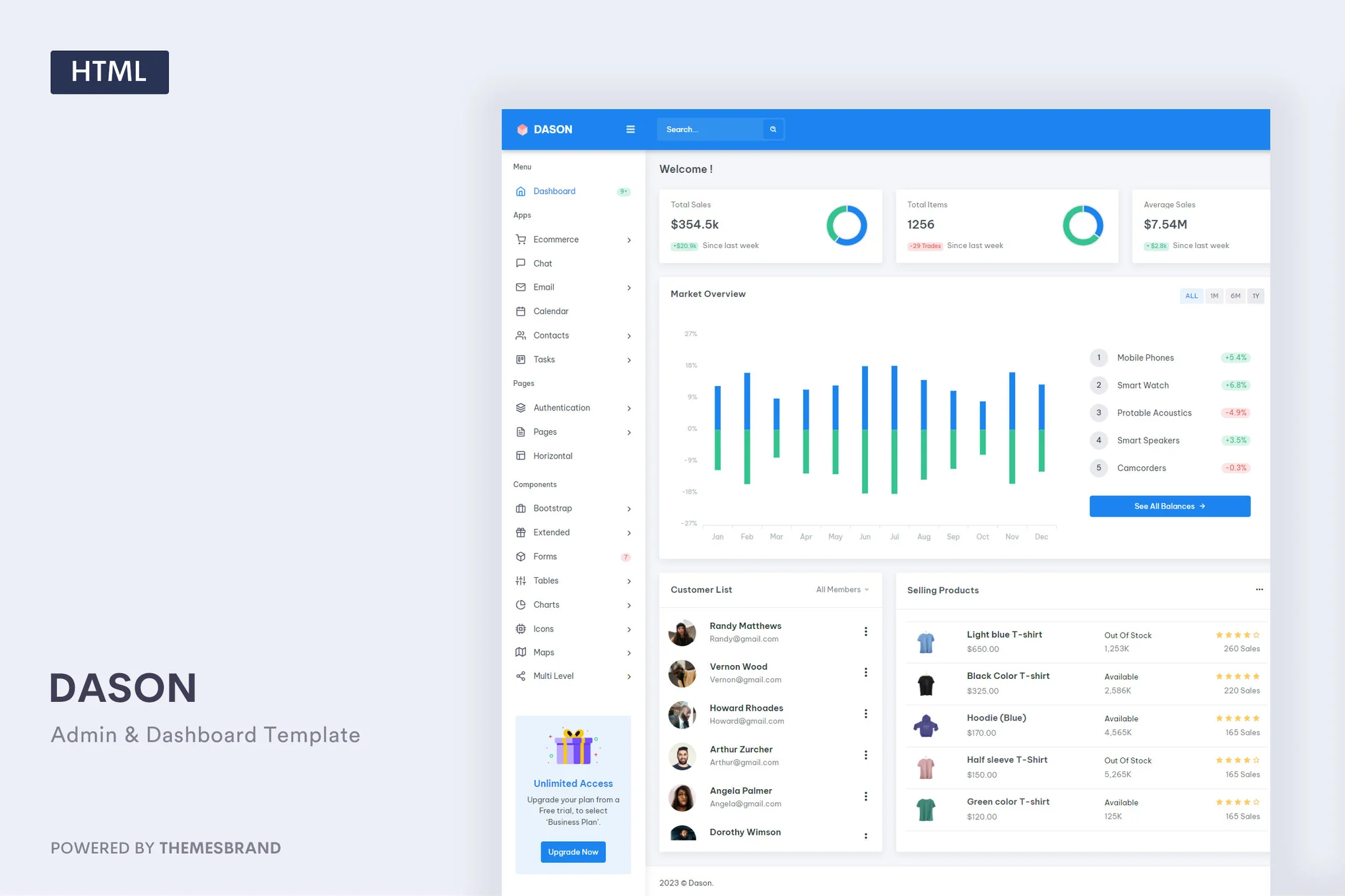 Dason adalah template dasbor admin yang dirancang dengan sangat baik, minimalis, dan bersih, dengan opsi mode Gelap, Terang, dan RTL. Anda dapat membangun berbagai jenis aplikasi web seperti antarmuka berbasis SaaS, eCommerce, Crypto, CRM, CMS, aplikasi manajemen proyek, panel admin, dan banyak lagi.