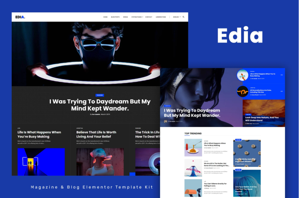 Edia adalah Template Kit Blog/Majalah Elementor yang sempurna untuk memenuhi kebutuhan blogger. Desain yang bersih dan seimbang dari Edia menjadikannya pilihan terbaik bagi para blogger. Kit ini mencakup banyak template yang mudah diedit menggunakan pembuat halaman Elementor untuk WordPress dan telah dioptimalkan untuk digunakan dengan tema Hello Elementor yang gratis, namun dapat digunakan dengan sebagian besar tema yang mendukung Elementor.