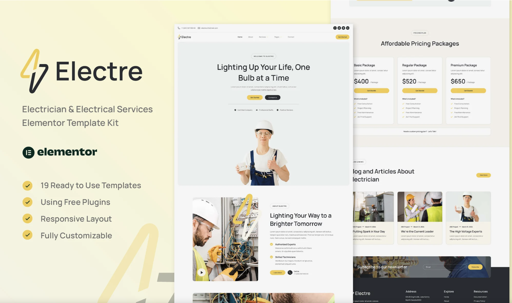 Electre – Template Kit Elementor untuk Layanan Listrik & Elektrikal (BUKAN Tema WordPress) yang dibuat khusus untuk bisnis listrik, tukang listrik, perusahaan layanan listrik, perbaikan kabel, toko pencahayaan, atau bisnis lain yang ingin mempublikasikan layanan mereka secara profesional. Electre memiliki desain yang sederhana, modern, dan bersih dengan tata letak responsif 100%, sangat mudah disesuaikan, dan dapat digunakan oleh siapa saja tanpa harus memahami pengkodean. Kit template ini mencakup 14 halaman yang dirancang dengan cermat dan 19 template menakjubkan, Anda dapat membangun situs web yang tampak profesional hanya dengan sekali klik.