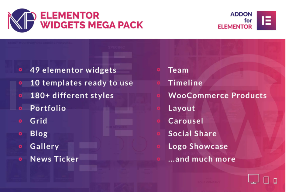 Selamat datang di Elementor Widgets Mega Pack. Dengan plugin luar biasa ini, Anda akan mendapatkan 49 widget Elementor dan 10 template siap pakai serta lebih dari 180 gaya berbeda untuk Elementor.