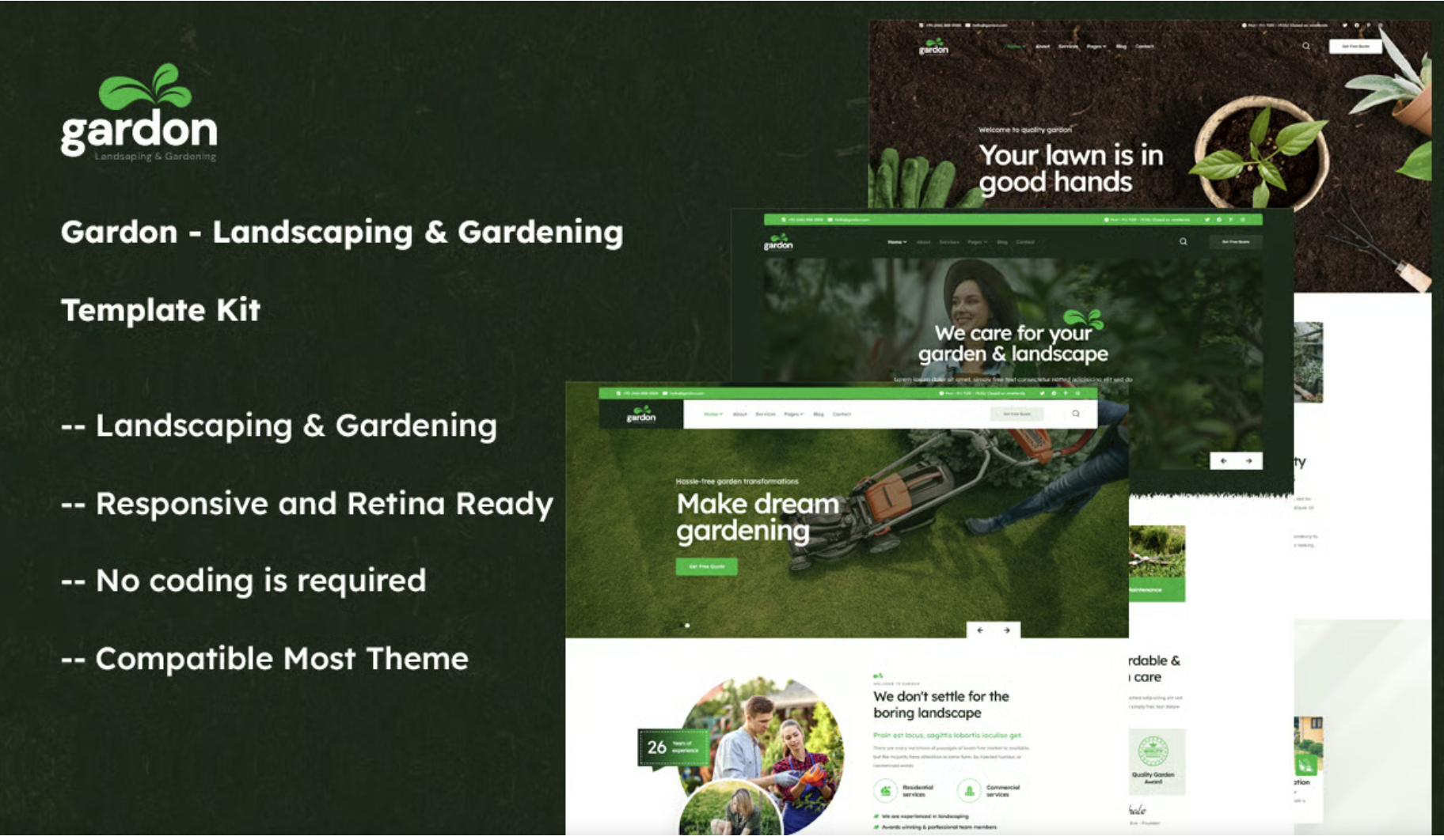 Gardon – Landscaping & Gardening Template Kit adalah Template Kit Elementor modern dan bersih yang ideal untuk semua jenis agensi seperti landscaper, layanan perawatan taman, bisnis taman, bisnis landscaping, desainer taman & lanskap, serta situs web perawatan taman dan lanskap lainnya.