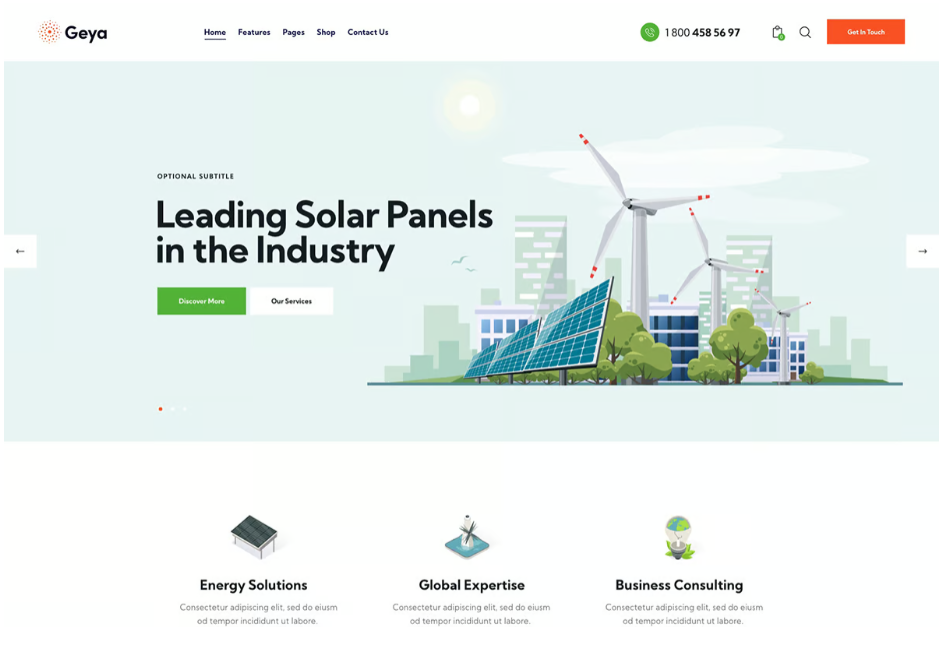 Geya adalah tema WordPress yang segar dan bergaya dengan konsep multi-purpose yang dirancang khusus untuk bisnis yang berhubungan dengan ekologi. Tema ini cocok untuk organisasi non-profit yang berfokus pada lingkungan serta bisnis terkait dengan daur ulang, distribusi sumber energi alternatif, badan pelestarian lingkungan, biro penggalangan dana, situs web yang berhubungan dengan organik dan biologi, penelitian ilmiah, atau kampanye sosial.