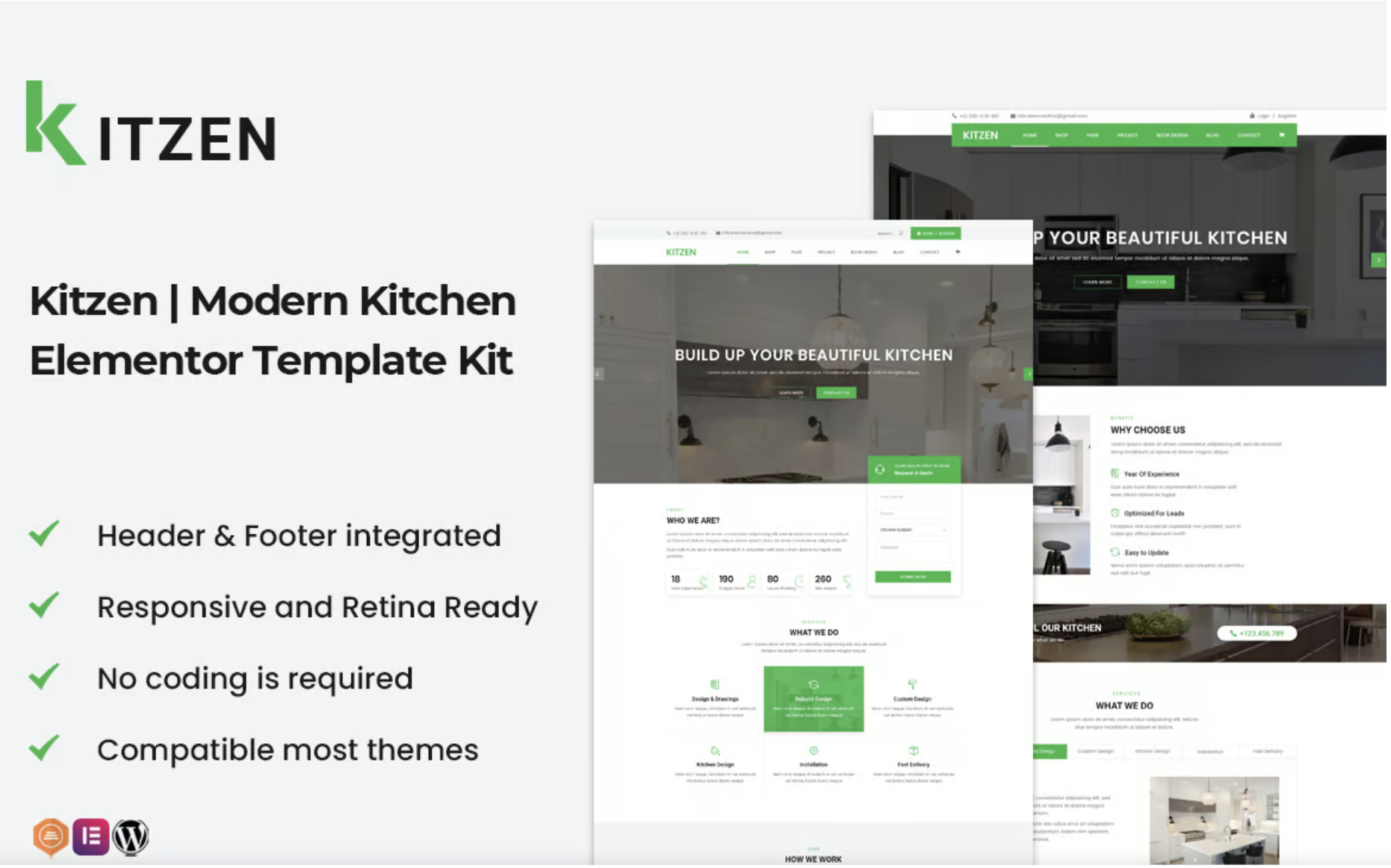 Kitzen | Modern Kitchen Elementor Template Kit adalah Template Kit Elementor yang dirancang khusus untuk situs web produk furnitur modern, seperti dapur, ruang tamu, kamar tidur, atau kantor.