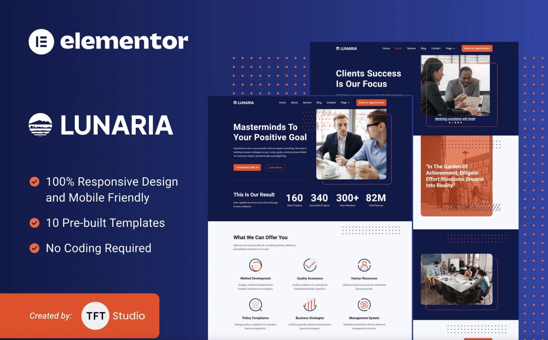 Lunaria adalah Template Kit Elementor yang dirancang untuk firma konsultasi, di mana penasihat strategis memberikan solusi yang disesuaikan untuk kesuksesan bisnis! Website ini adalah pilihan tepat untuk mempublikasikan layanan konsultasi profesional.