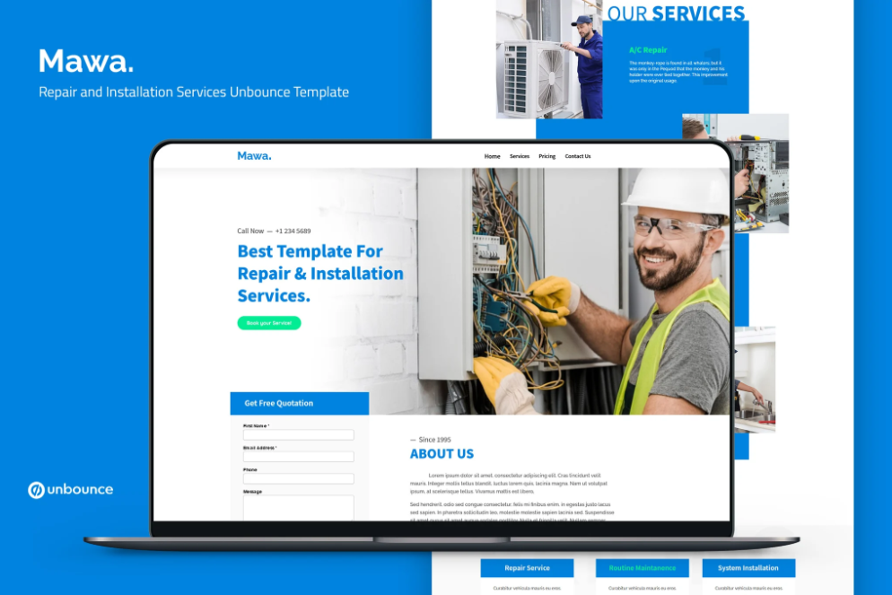 Mawa Repair And Installation Unbounce Teamplate adalah Template Halaman Pendaratan Unbounce Responsif yang Kreatif untuk berbagai tujuan. Template ini dapat digunakan untuk layanan Pemanas, Pendingin, Pipa, Instalasi & Pemeliharaan Listrik, dan sejenisnya.