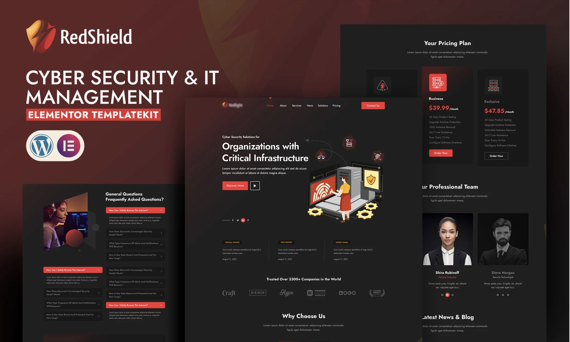 RedShield Cyber Security & IT Management adalah template PSD modern yang didedikasikan untuk layanan Keamanan dan Manajemen TI. Template ini ideal untuk perusahaan yang bergerak dalam bidang Keamanan Siber, Organisasi Infrastruktur, Privasi Data, Agen Intelijen, dan layanan Manajemen TI lainnya. Template Kit ini menggunakan gambar demo dari Envato Elements. Anda perlu melisensikan gambar ini dari Envato Elements untuk menggunakannya di situs web Anda, atau Anda dapat menggantinya dengan gambar Anda sendiri.
