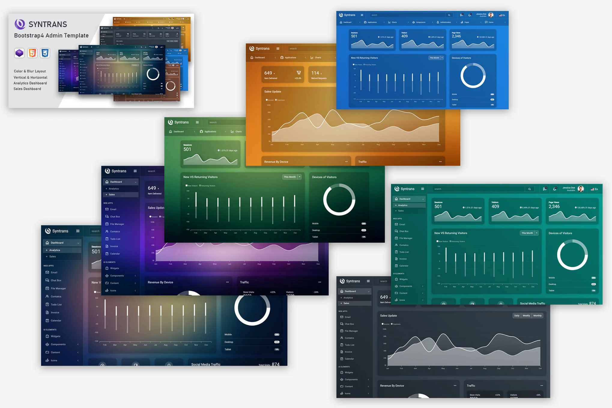 Syntrans adalah template admin responsif berbasis Bootstrap 4. Template ini memiliki variasi dasbor yang beragam dan dibangun menggunakan kerangka kerja Bootstrap 4 terbaru. Template ini kompatibel dengan semua browser web utama, perangkat desktop, dan smartphone. Syntrans sangat mudah disesuaikan dan ramah pengembang. Dengan koleksi besar komponen UI serta plugin jQuery dan Bootstrap terbaru, template ini cocok digunakan untuk berbagai aplikasi web seperti dasbor eCommerce, panel admin kustom, admin manajemen proyek, CRM, CMS, dan lainnya.
