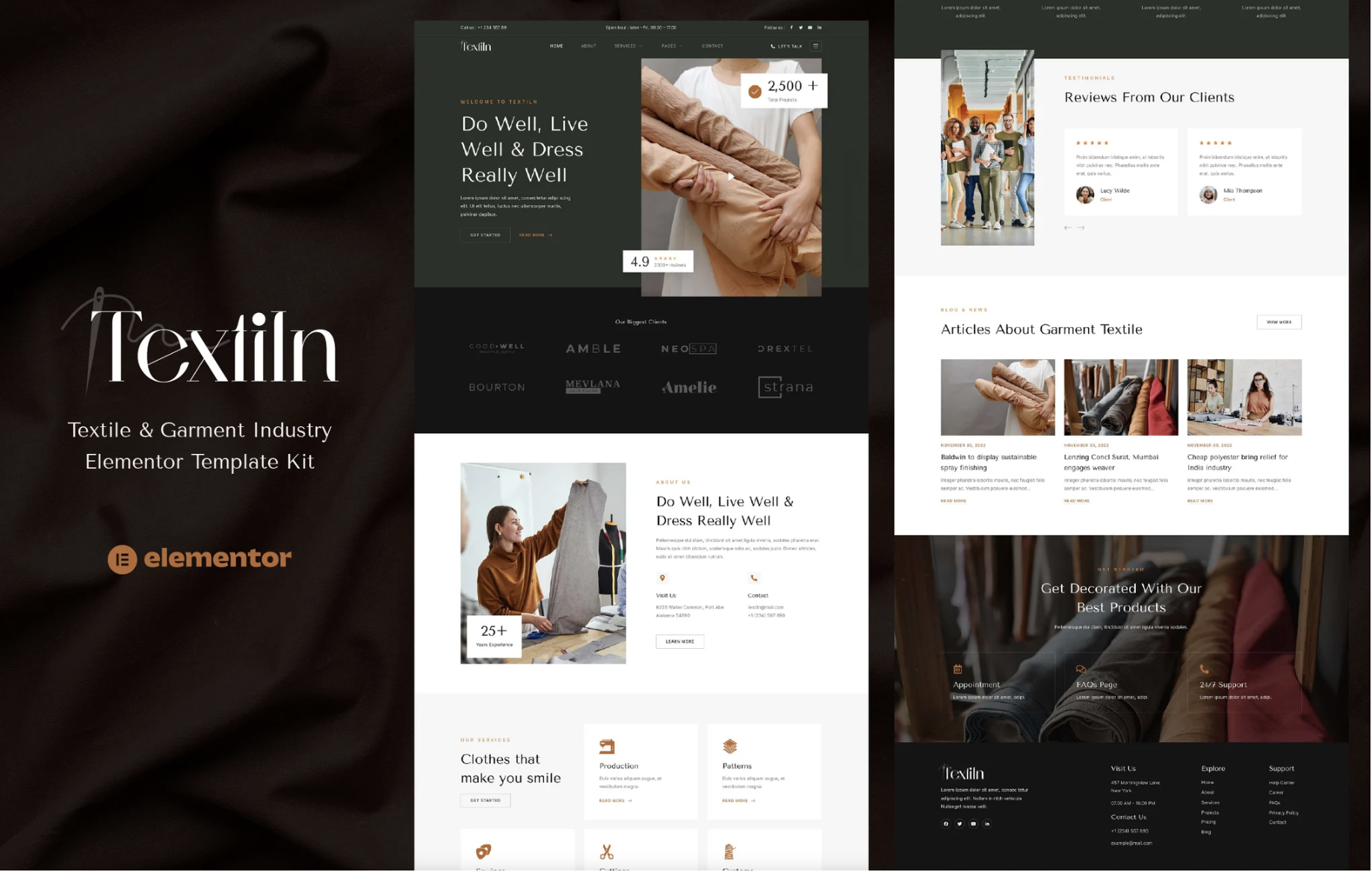 Textiln – Kit Template Elementor untuk Industri Tekstil & Pakaian, dibuat khusus untuk Industri Tekstil & Pakaian, Bisnis Tekstil, Manufaktur Tekstil, Perusahaan Pakaian, Pabrik Kain, dan bisnis manufaktur terkait. Textiln memiliki desain yang sederhana, modern, dan bersih dengan tata letak 100% responsif, sangat mudah disesuaikan, dan dapat digunakan oleh siapa saja tanpa perlu memahami pengkodean.