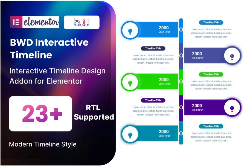 Timeline adalah plugin WordPress berbasis Elementor yang ringan untuk menambahkan Timeline Interaktif ke situs web Anda tanpa memerlukan pengetahuan pemrograman. Tersedia 24 desain preset Timeline Interaktif unik yang terlihat luar biasa. Untuk informasi lebih lanjut, lebih dari 100 desain tambahan akan segera disertakan.